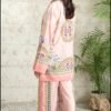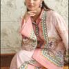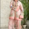 This elegant tea-pink crepe co-ord set features intricate floral and geometric prints. The relaxed shirt with bold, ornate borders and billowing sleeves pairs perfectly with matching wide-leg pants, creating a graceful and stylish look that’s ideal for both casual and special occasions.