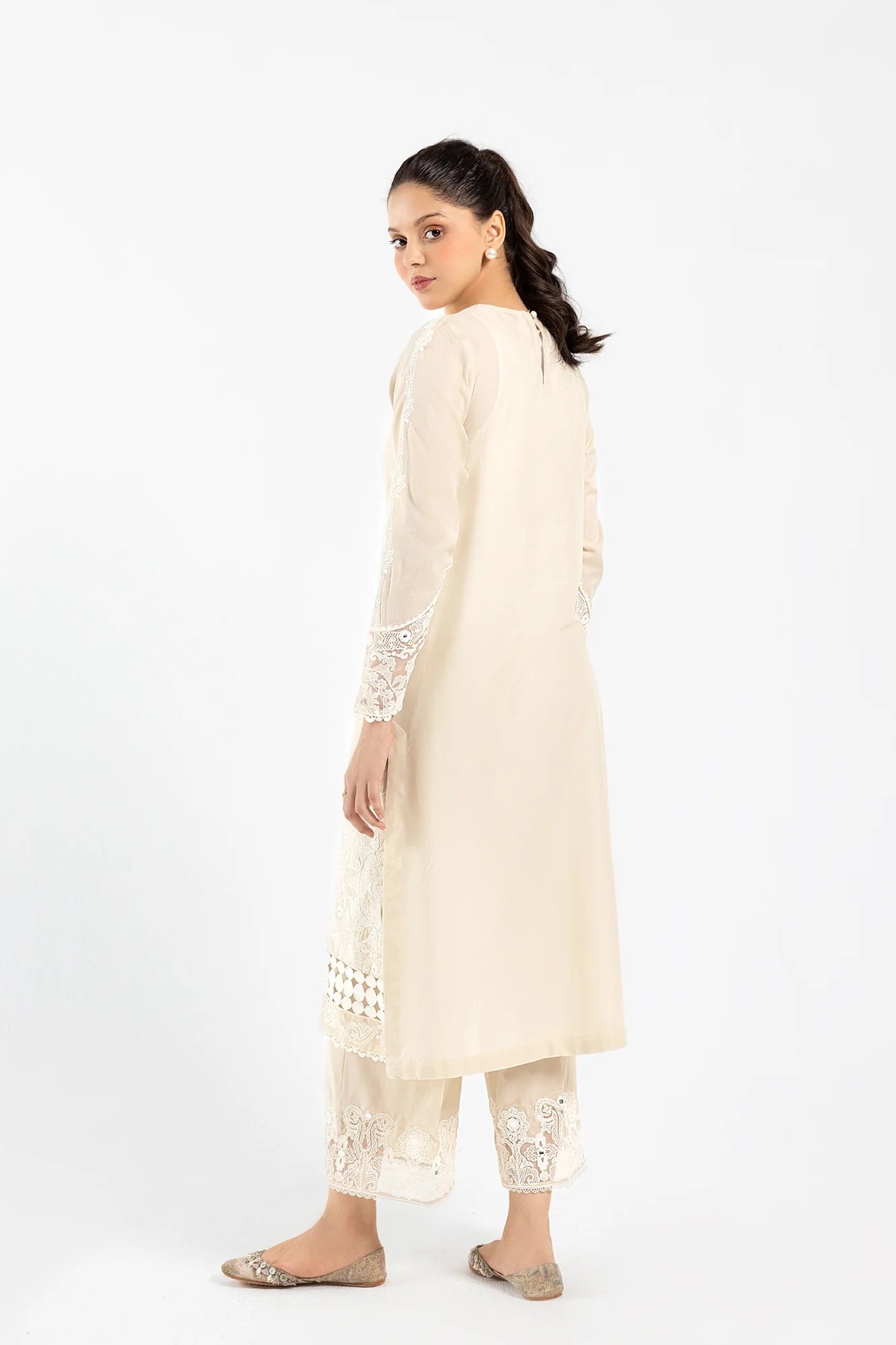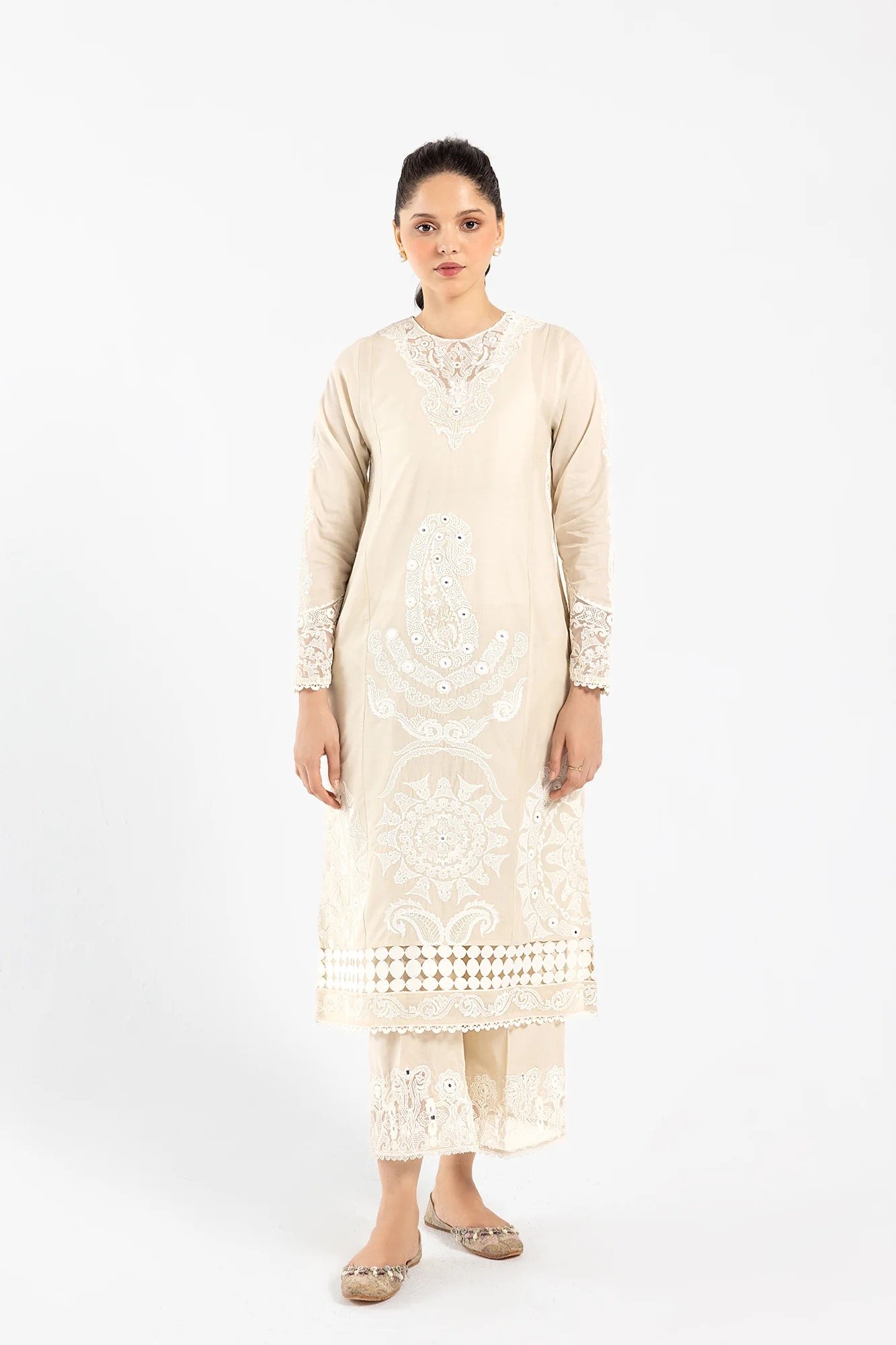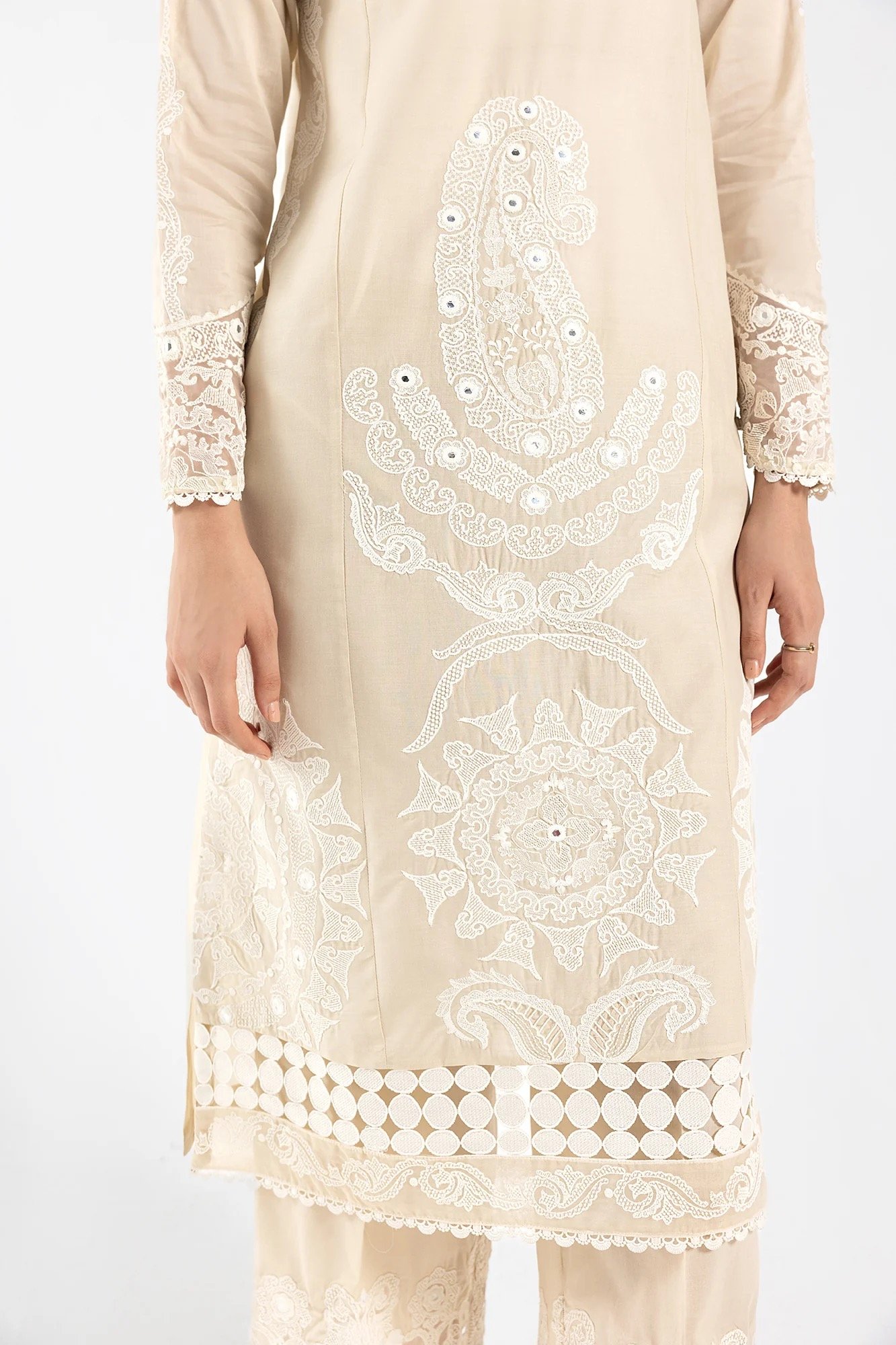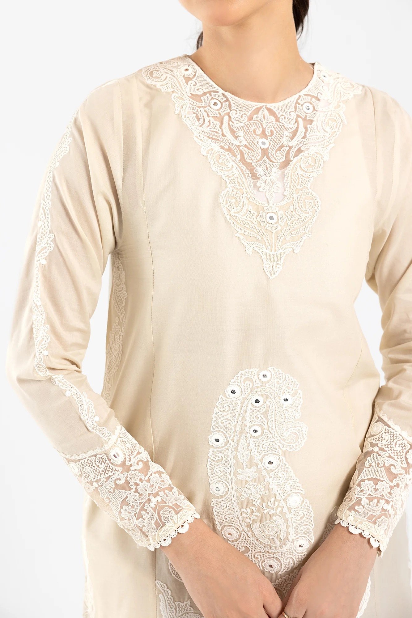 A classically rich composition is portrayed on this elegant ensemble rendered in an earthy stone shade. It features a mesmerizing shirt beautifully adorned with intricate embroidery with floral designs and enhanced with artificial mirror details. Paired with a matching embroidered trouser, this graceful yet elegant outfit is a style statement for fun gatherings to look sophisticated this season.