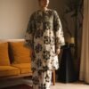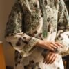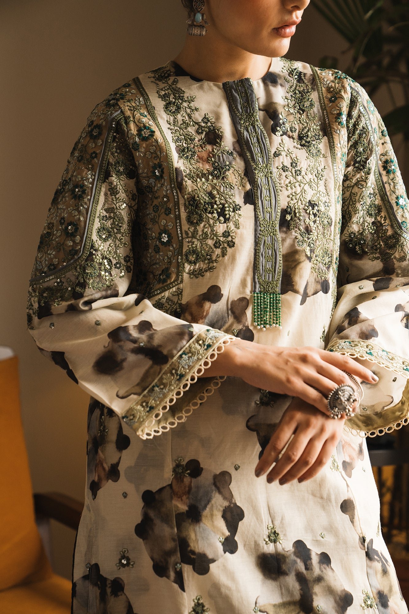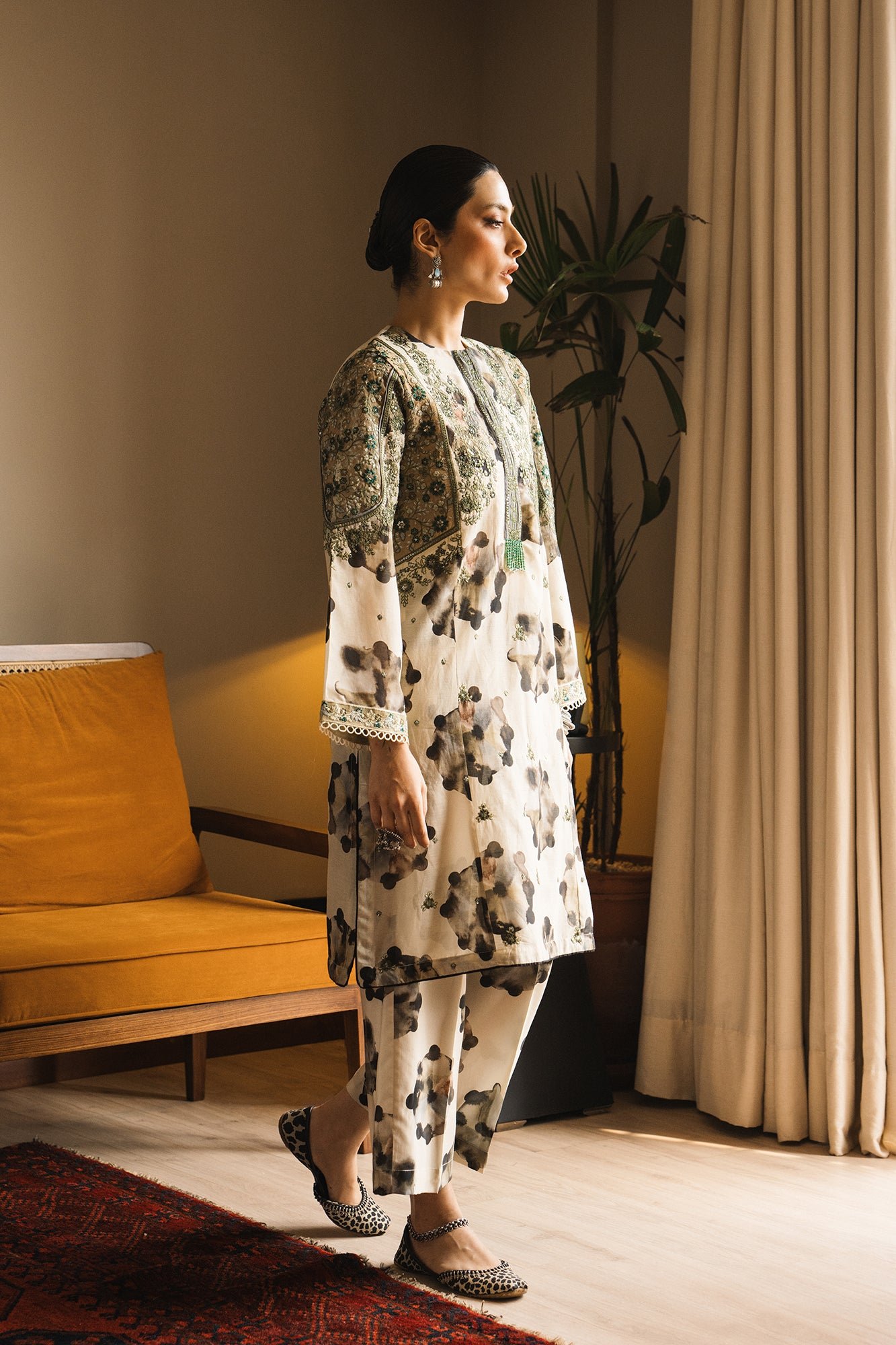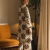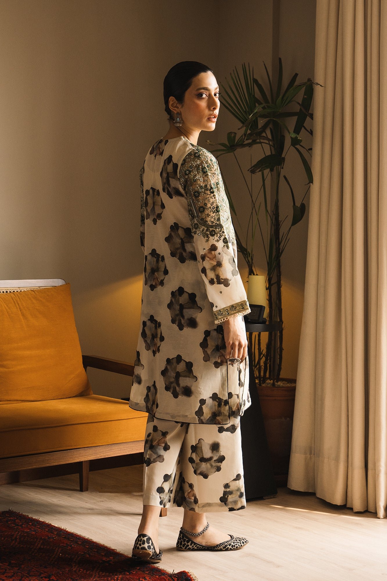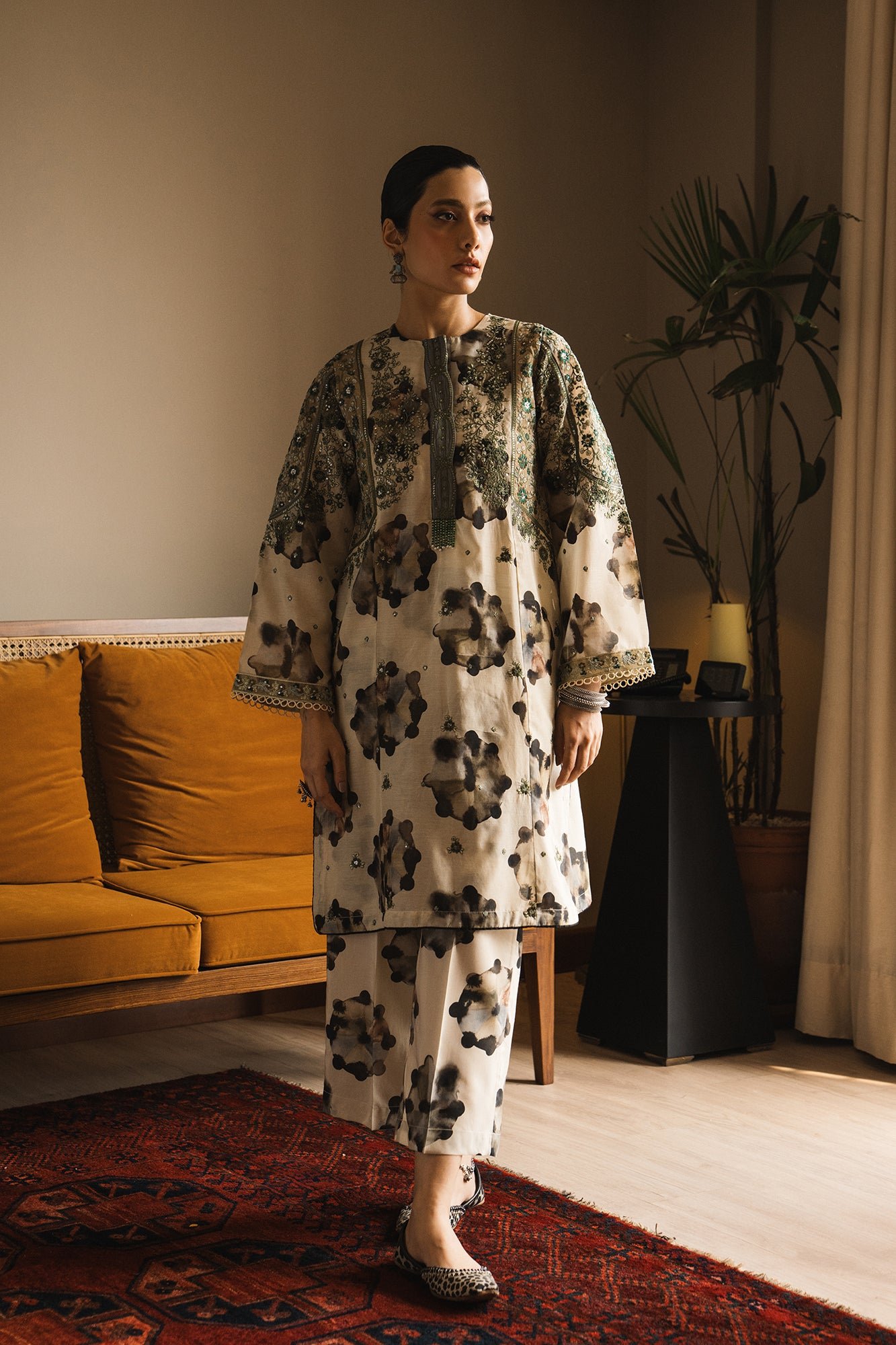 A gracefully elegant composition is portrayed on this classy ensemble rendered in a subtle lemon icing shade. It features a contemporary silhouette shirt beautifully adorned with artistic tie and dye prints in monochromatic colors. Enhanced with intricate floral embroidery with scintillating sequins details, the chic shirt is paired with a contemporary printed culotte trouser. This fascinating outfit is a perfect option for formal gatherings this season.