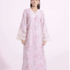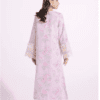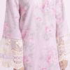 A gracefully elegant composition is portrayed on this classy ensemble rendered in lilac ice shade. It features a contemporary silhouette shirt beautifully adorned with floral prints in blooming colors. Enhanced with intricate embroidery at front and sleeves with schiffli designs in ivory white hues, the chic shirt is paired with a matching trouser, a perfect option for fun gatherings with friends this season.