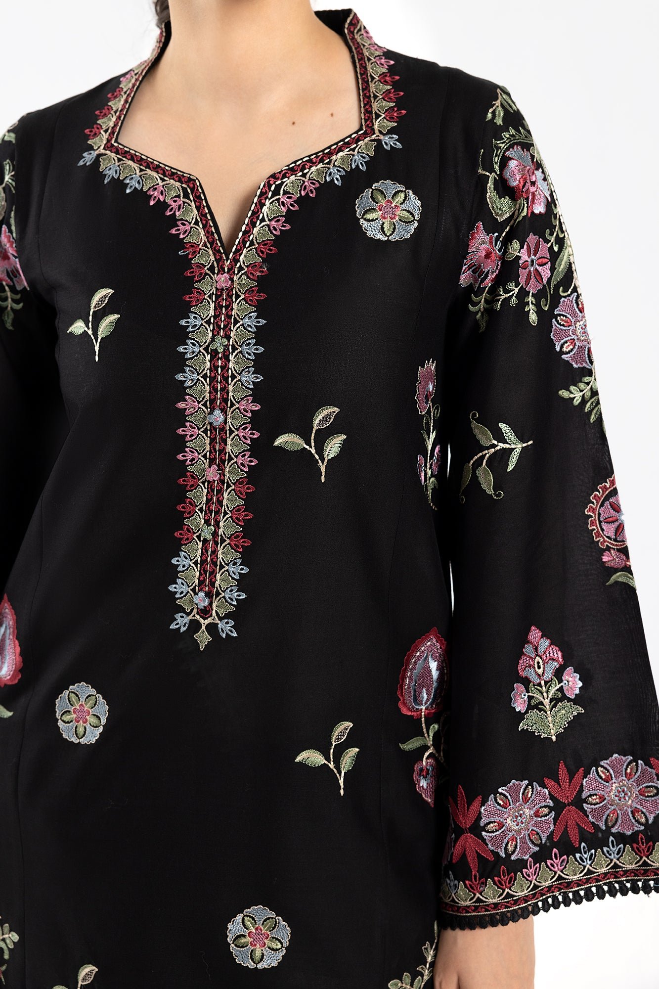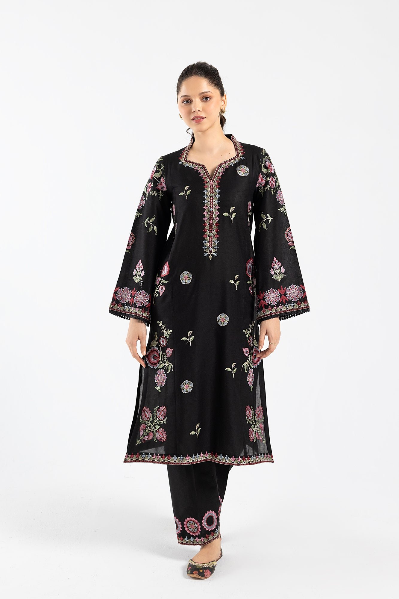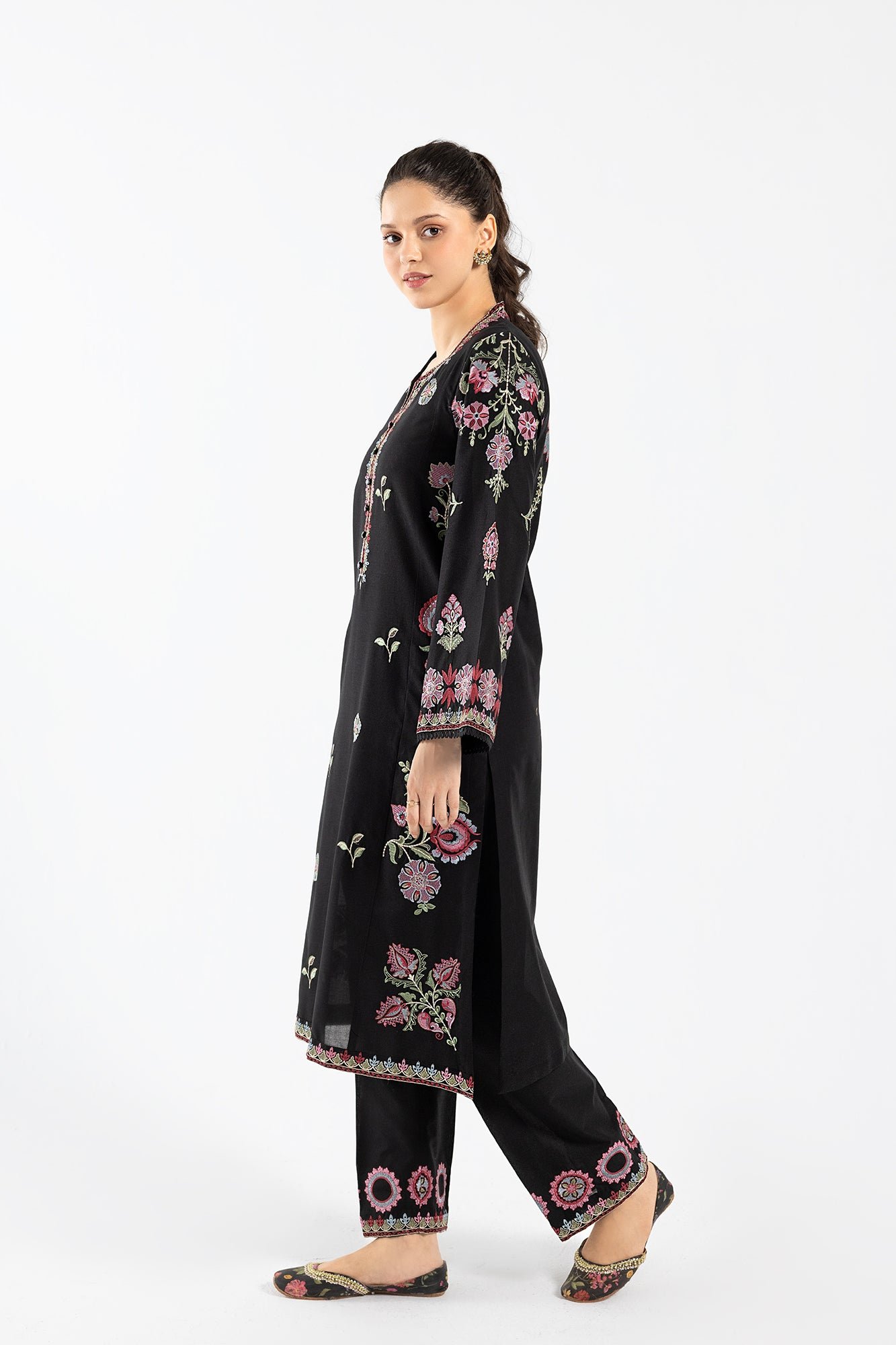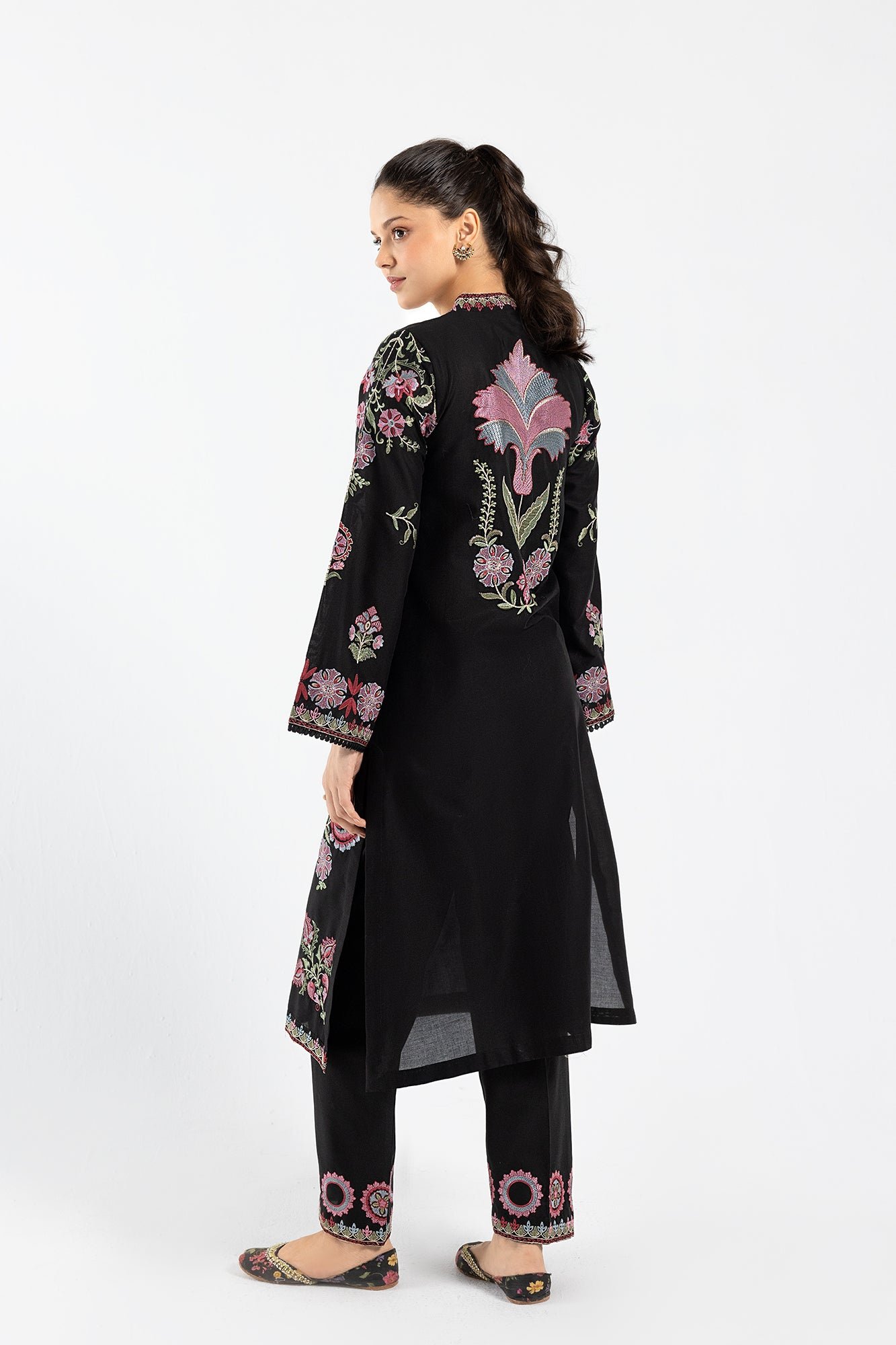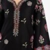 This alluring outfit is the perfect mix of elegance and charm. Its jet black shirt is enhanced with beautiful floral embroidery in vibrant hues illustrating mesmerizing designs. Completing the graceful outfit with a contemporary embroidered trouser for a gorgeous overall look to style this season.