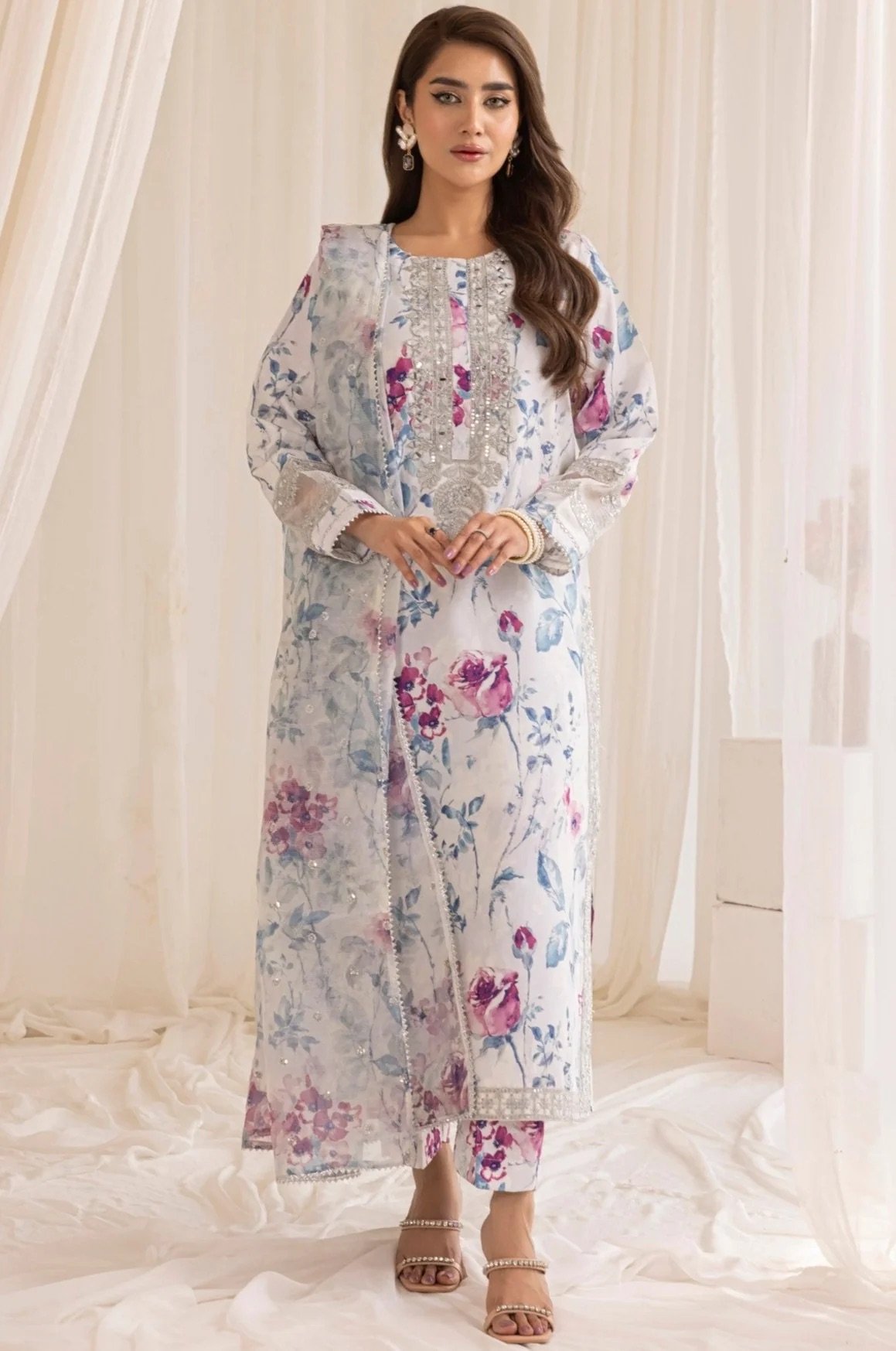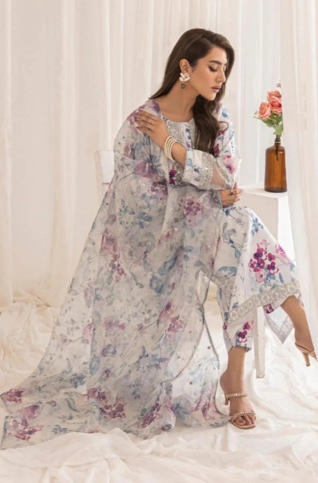 SILK LAWN PRINTED SHIRT ADORNED WITH EMBROIDERED NECKLINE , SLEEVES, FRONT & CHAWK PATTI ALONG WITH MIRROR WORK DETAILS