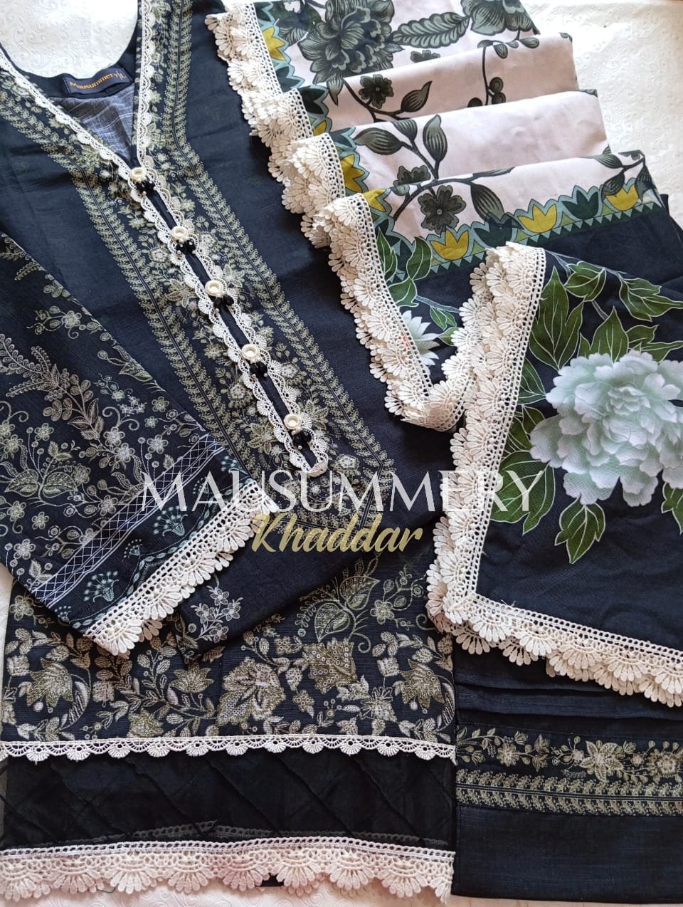 Digital Printed Khaddar Shirt Along Beautiful Laces & Handwork.