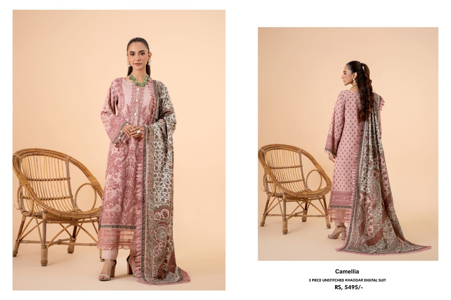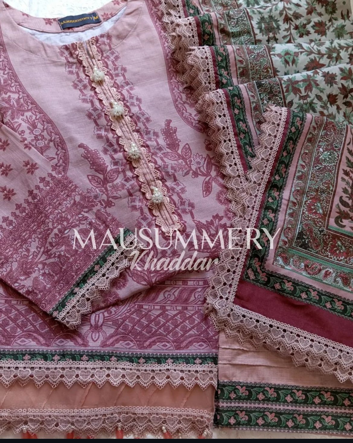 Digital Printed Khaddar Shirt Along Beautiful Laces & Handwork. Digital Printed Khaddar Dupatta With 4 Side Laces . Dyed Khaddar Trouser.