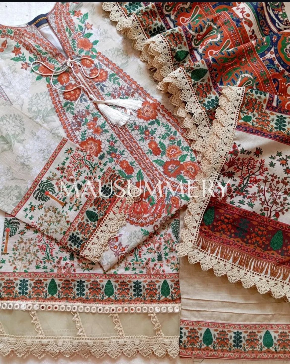 Digital Printed Khaddar Shirt Along Beautiful Laces & Handwork.