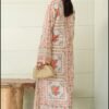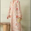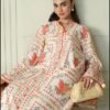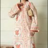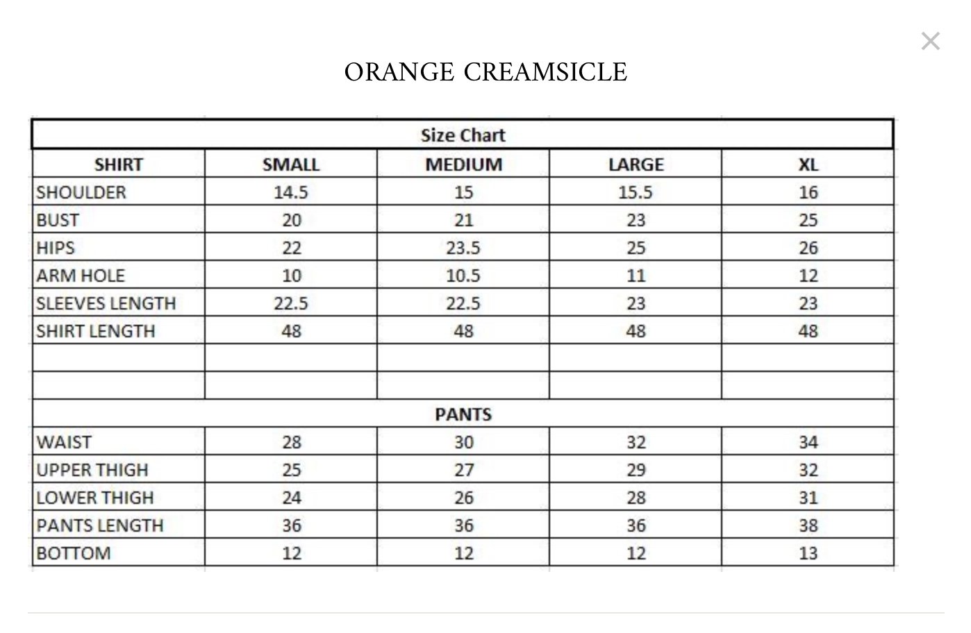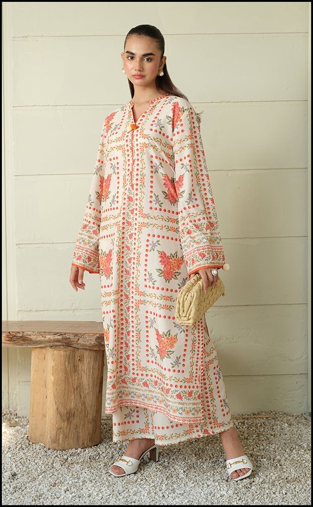 An artfully composed botanical print featuring an ivory A line shirt and loose izar cut from crepe. Striking tangerine hued floral patterns to make you stand apart