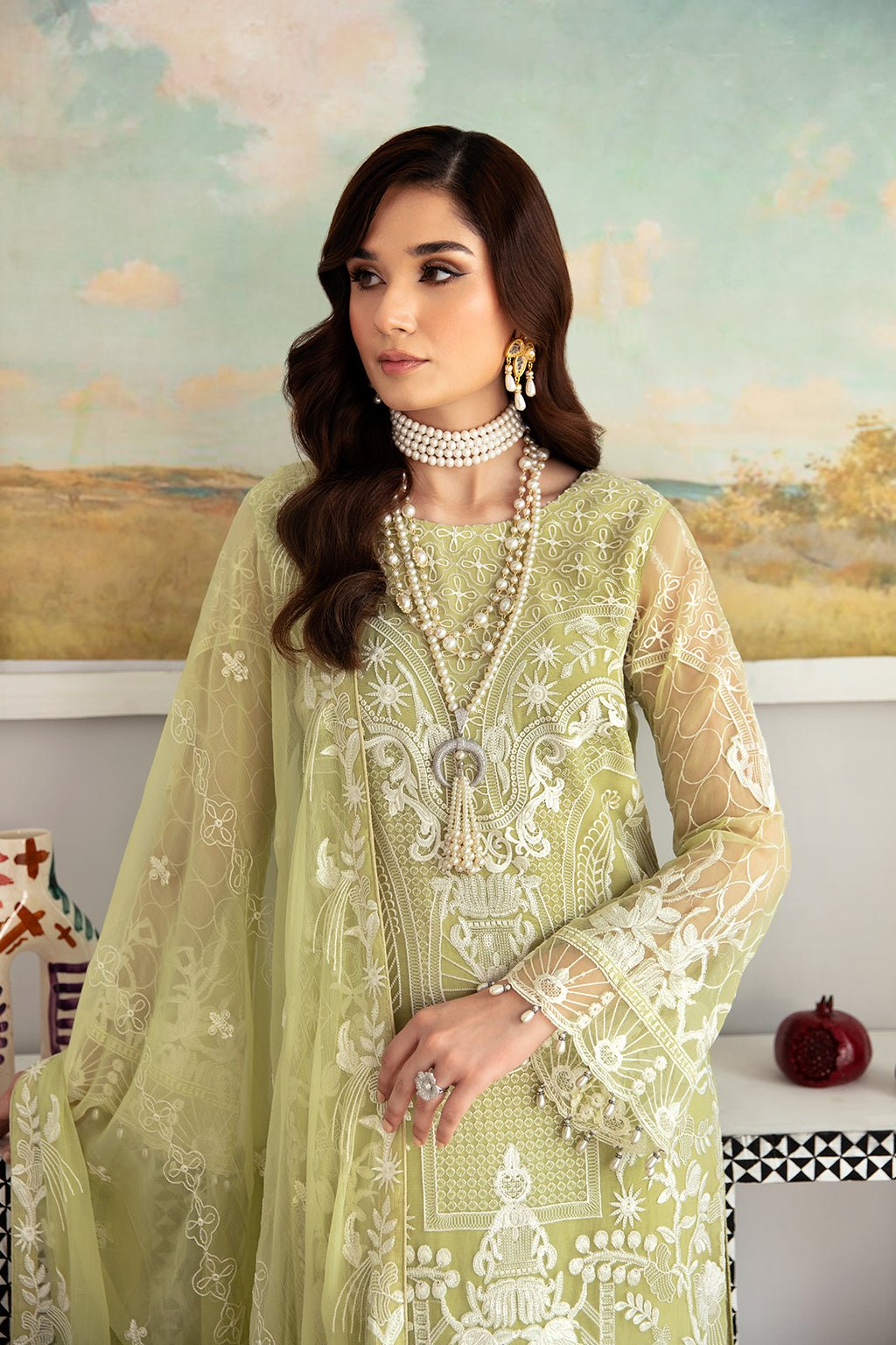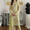 Embroidered Chiffon front with sequins Embroidered Chiffon back Embroidered Chiffon sleeves with pasting Embroidered organza sleeves lace Embroidered organza ghera lace Embroidered Net dupatta Raw silk trouser Embroidered organza trouser lace