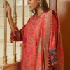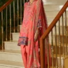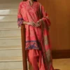 In the ethereal shade of georgia peach, this digital-printed linen ensemble weaves chrysanthemum flowers into a tapestry of grace, as delicate embroidery motifs rain down like a gentle shower of blooms. Paired harmoniously with cotton-dyed pants and a printed khaddar dupatta, it’s an ode to the beauty found in nature’s embrace.