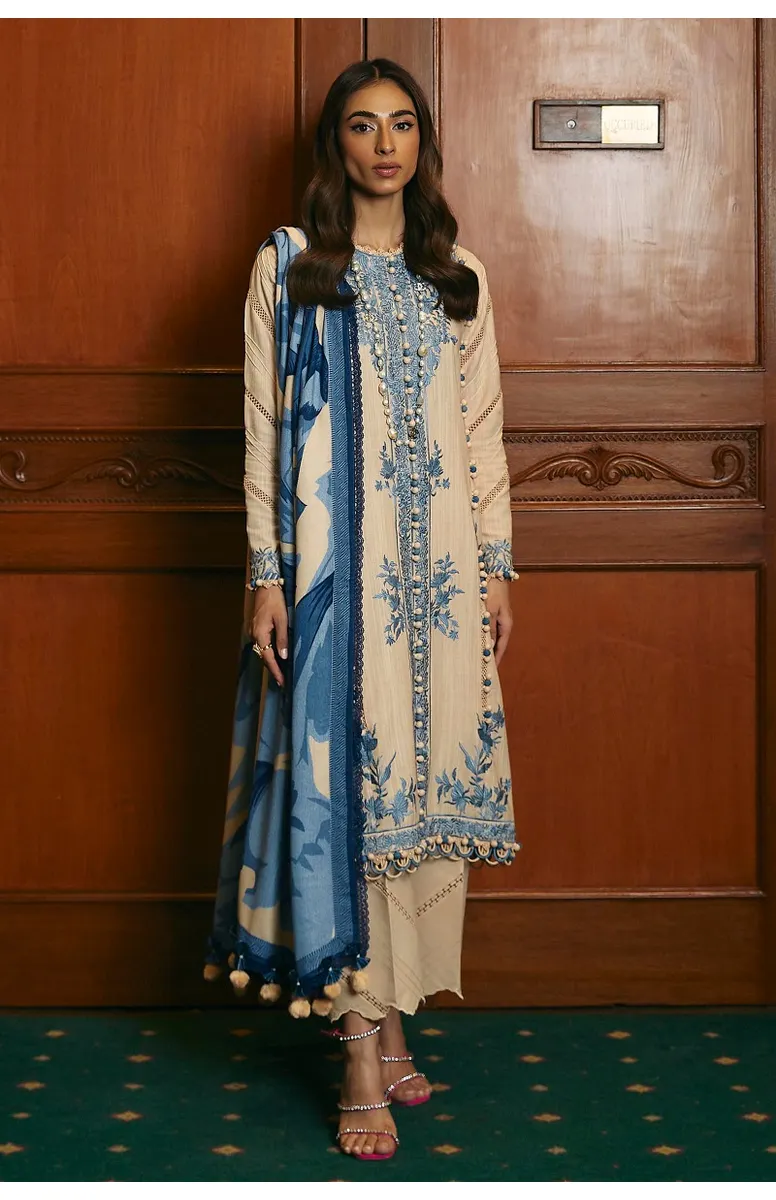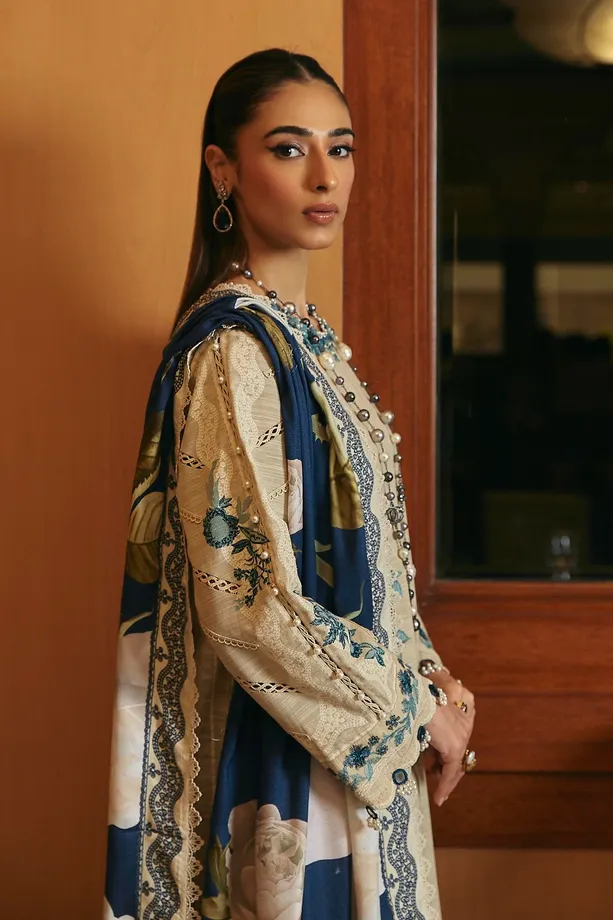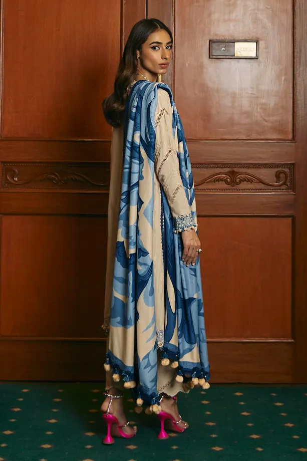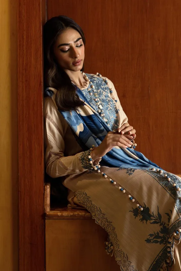 In the world of attire, a dyed slub shirt with tufts blue embroidery stands as a serene storyteller, accompanied by the simplicity of cotton-dyed pants, all wrapped in the intricate narratives of a printed pashmina shawl, crafting an ensemble that whispers tales of elegance.