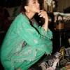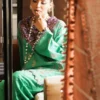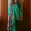 In seamless unity, the essence of flowers and heritage entwine gracefully with the understated charm of cotton-dyed pants, while the printed pashmina shawl drapes as a masterpiece of timeless allure.
