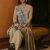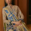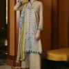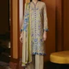 Amidst a garden of art and craft, the shirt emerges as a living canvas, adorned with motifs that draw inspiration from robust blossoms and intricate trellis work. In harmonious partnership, it finds its counterpart in cotton pants, which gently convey a message of simplicity and comfort. Draped alongside is a printed pashmina shawl, embellished with patterns that pay homage to the bold motifs of the Mughal era, telling a vivid narrative of sartorial grace and cultural amalgamation.
