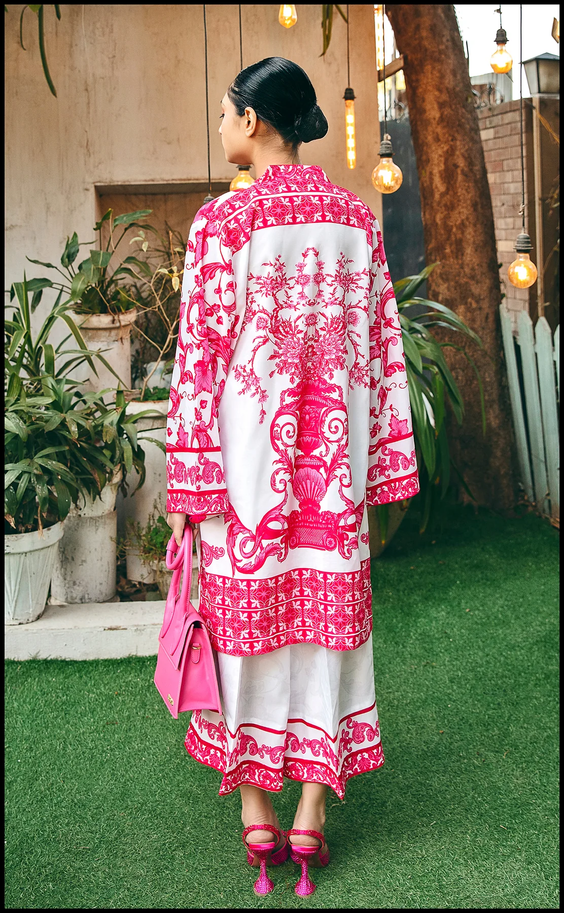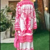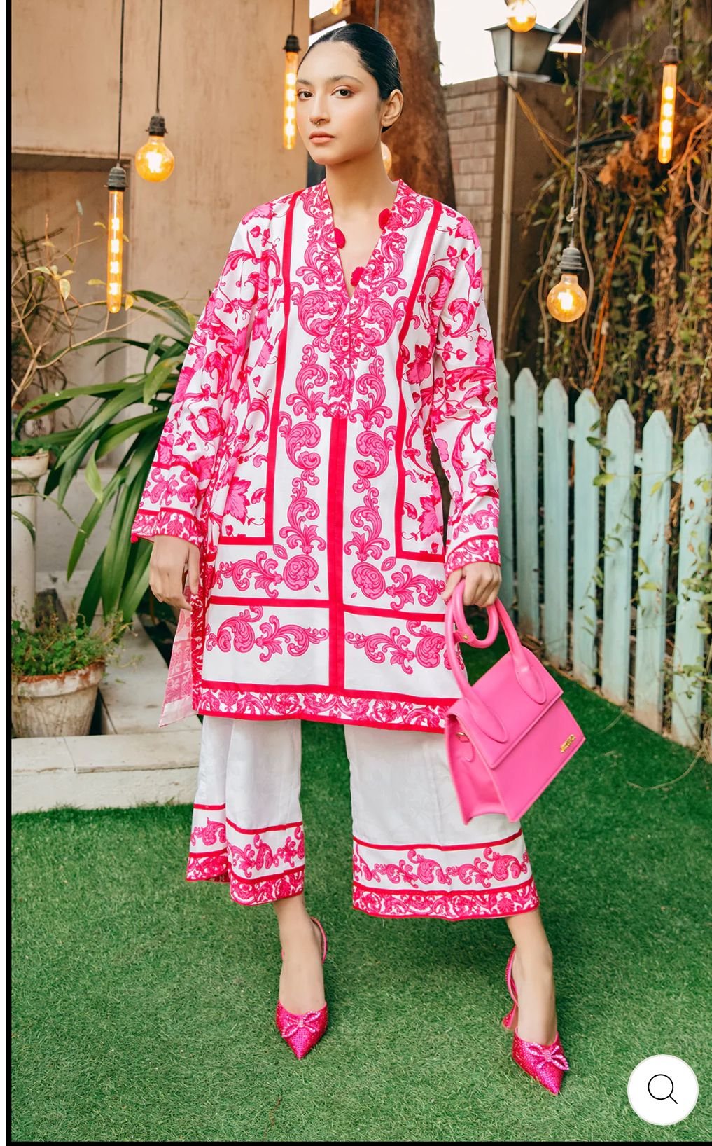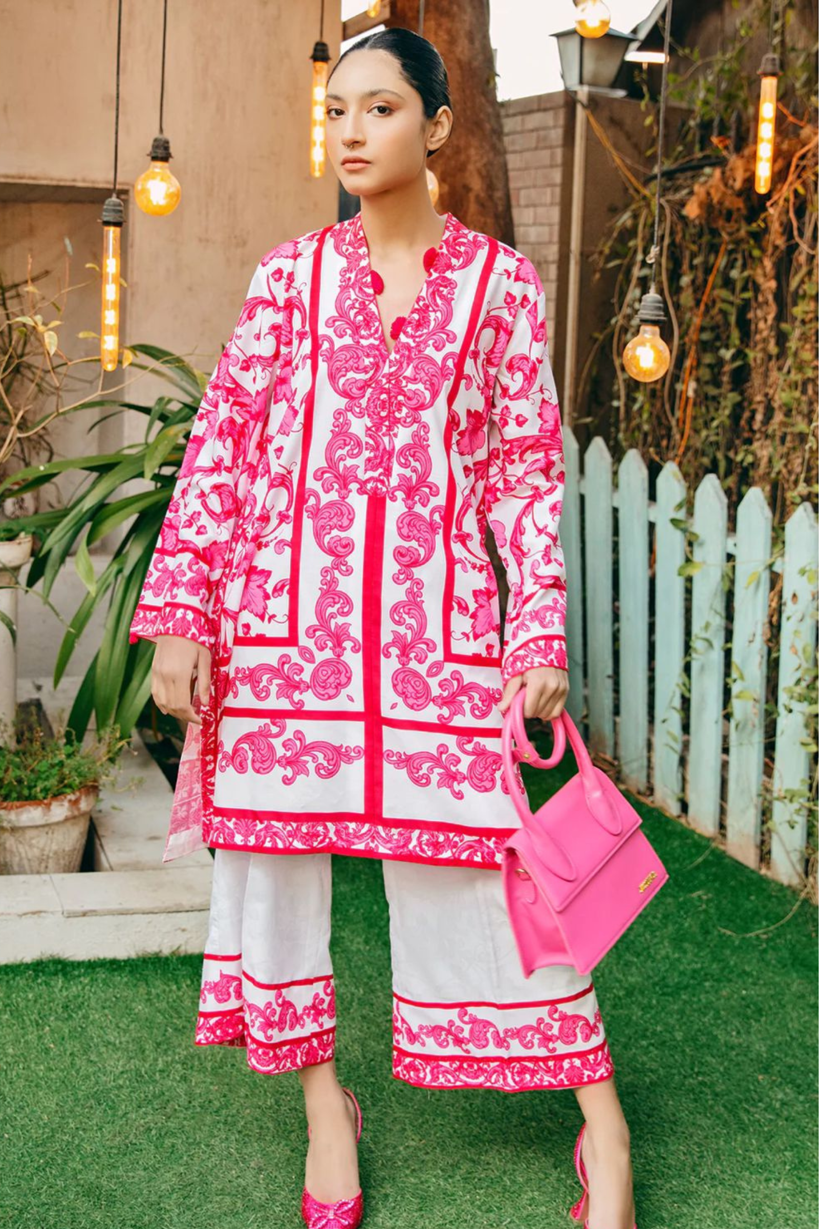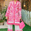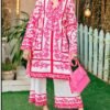Description: Make a statement with our stunning pink fusion , summer go to print co ord set. featuring the neck line and sleeves, adorned with cute fan shaped threaded pieces., Paired with loose trousers with beautifully patterned border details.