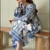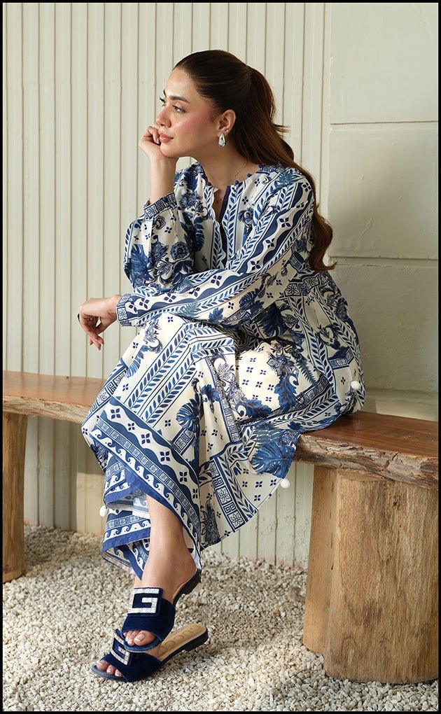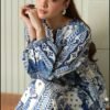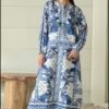A captivating crepe co-ord set featuring a refined blue and white tile motif. The relaxed top has billowing full-length sleeves and a modest, stylish neckline, blending comfort with elegance.